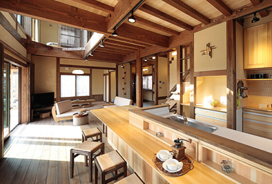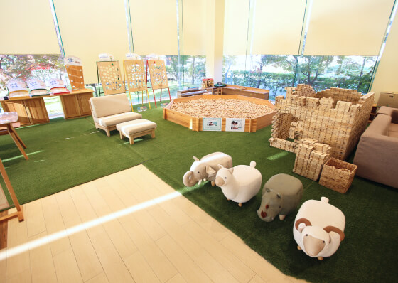 受付カウンターにてお客様のご要望に合わせたご案内をいたします。ここでは各部屋のサイズ感を実際に感じていただける展示スペースや、オリジナルの薪ストーブをすべてご覧いただけます。また、お子様連れでも楽しんでいただける木のプレイルームもご用意しています。