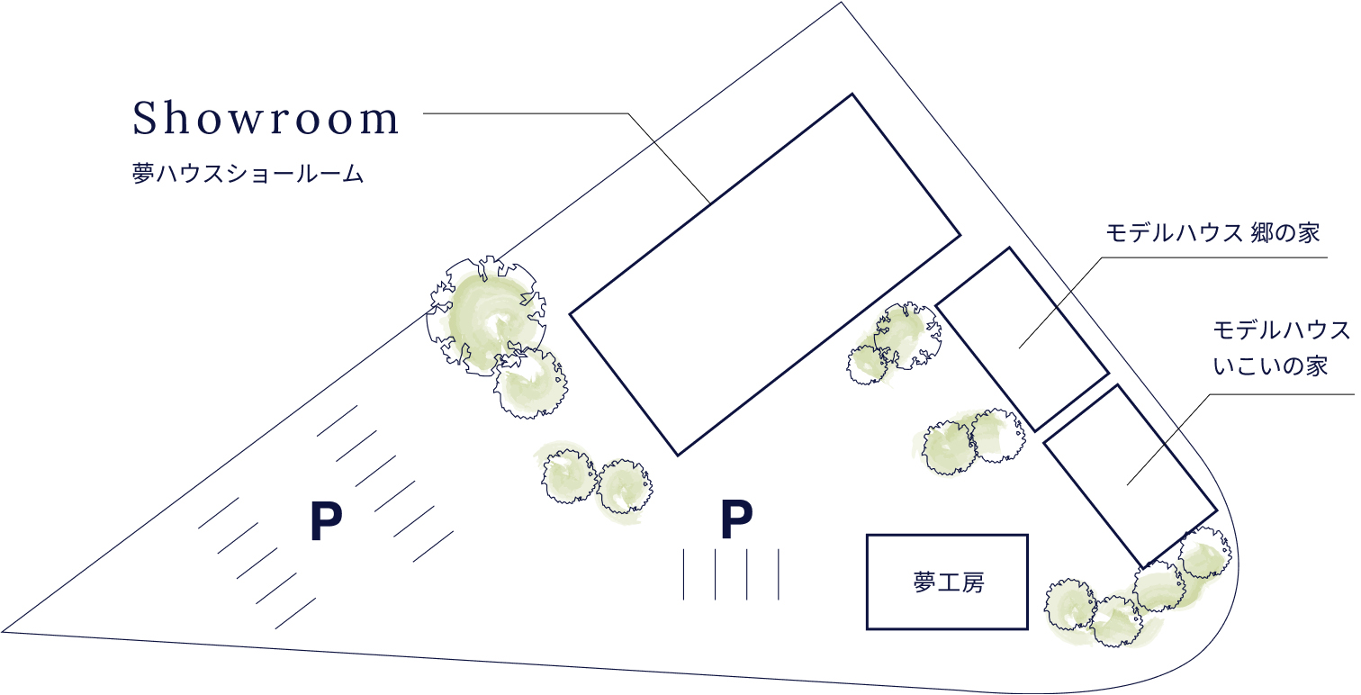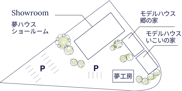 夢ハウスショールームと隣接する2棟モデルハウスや夢工房とともに、家づくりのすべてが集約されています。ショールームと合わせてご覧いただけます。